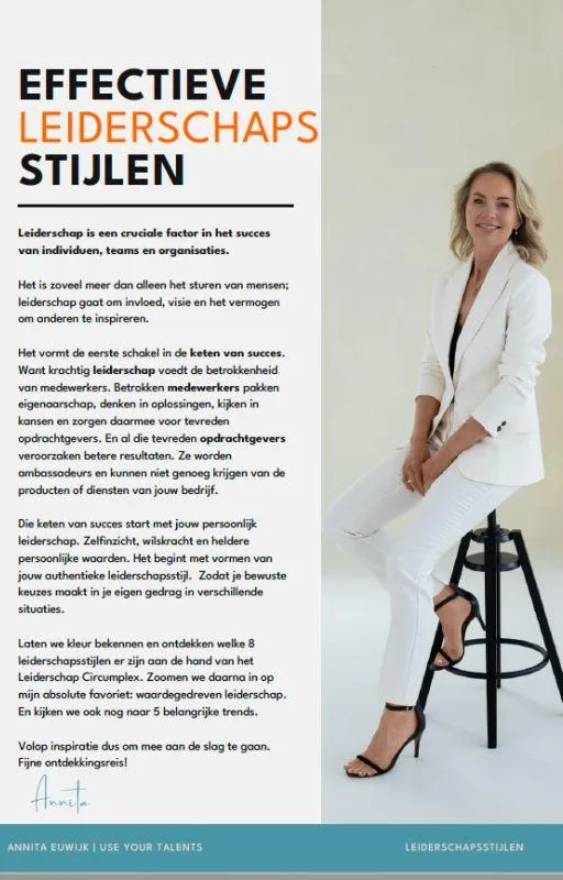 Met heel veel enthousiasme verzorgd Annita de trajecten effectief en talentgericht leiderschap en teamcoaching. Ik heb vele inzichten meegekregen, mogen oefenen aan de hand van o.a. bestaande casussen met twee keer een fijne club mensen op een fantastische plek.